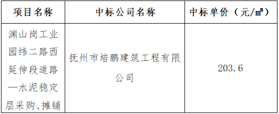 渊山岗工业园纬二路西延伸段道路工程专业分包中标结果公示